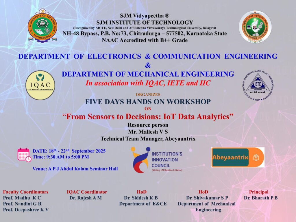 🛠️ Five Days Hands-on Workshop on “From Sensors to Decisions: IoT Data Analytics” The Department of Electronics & Communication Engineering and Mechanical Engineering organized a Five-Day Hands-on Workshop on “From Sensors to Decisions: IoT Data Analytics” from 18th to 22nd September 2025 at the Dr. APJ Abdul Kalam Seminar Hall. This workshop gave knowledge to