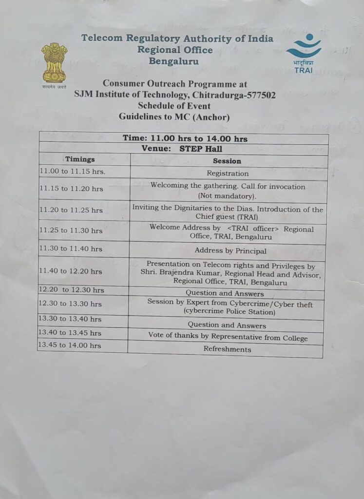 The Telecom Regulatory Authority of India (TRAI), Regional Office, Bengaluru, in association with SJM Institute of Technology, Chitradurga, organized a Consumer Outreach Programme at the STEP Hall with the objective of creating awareness about telecom consumer rights, privileges, and cyber safety. The programme featured informative sessions by TRAI officials, including a detailed presentation on telecom