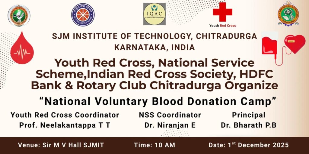National Voluntary Blood Donation Camp & AIDS Awareness Program The Youth Red Cross and National Service Scheme (NSS) units of SJM Institute of Technology, Chitradurga, in collaboration with the Indian Red Cross Society, HDFC Bank, and Rotary Club Chitradurga, organized two major health awareness initiatives on 1st December 2025 at Sir M V Hall, SJMIT