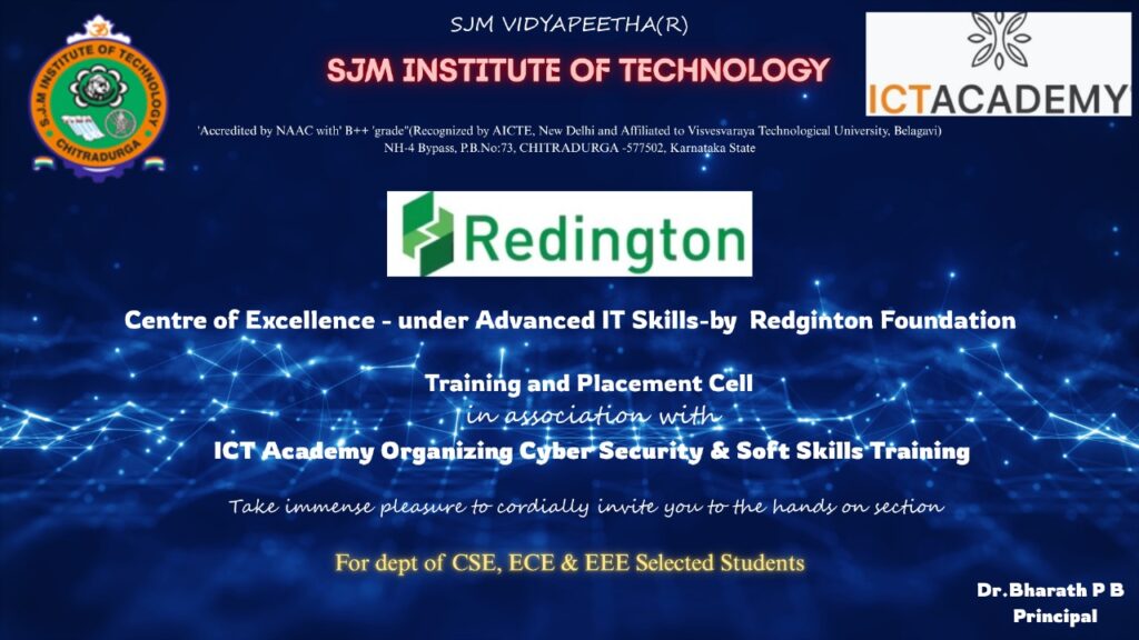 We are delighted to announce that Redington Foundation has signed a Memorandum of Understanding (MoU) with the ICT Academy to implement its Corporate Social Responsibility (CSR) initiative through the Advanced IT Skills Training Program at SJMIT Chitradurga. Under this initiative, a Centre of Excellence (CoE) is being established to provide Certificate Courses in Advanced IT