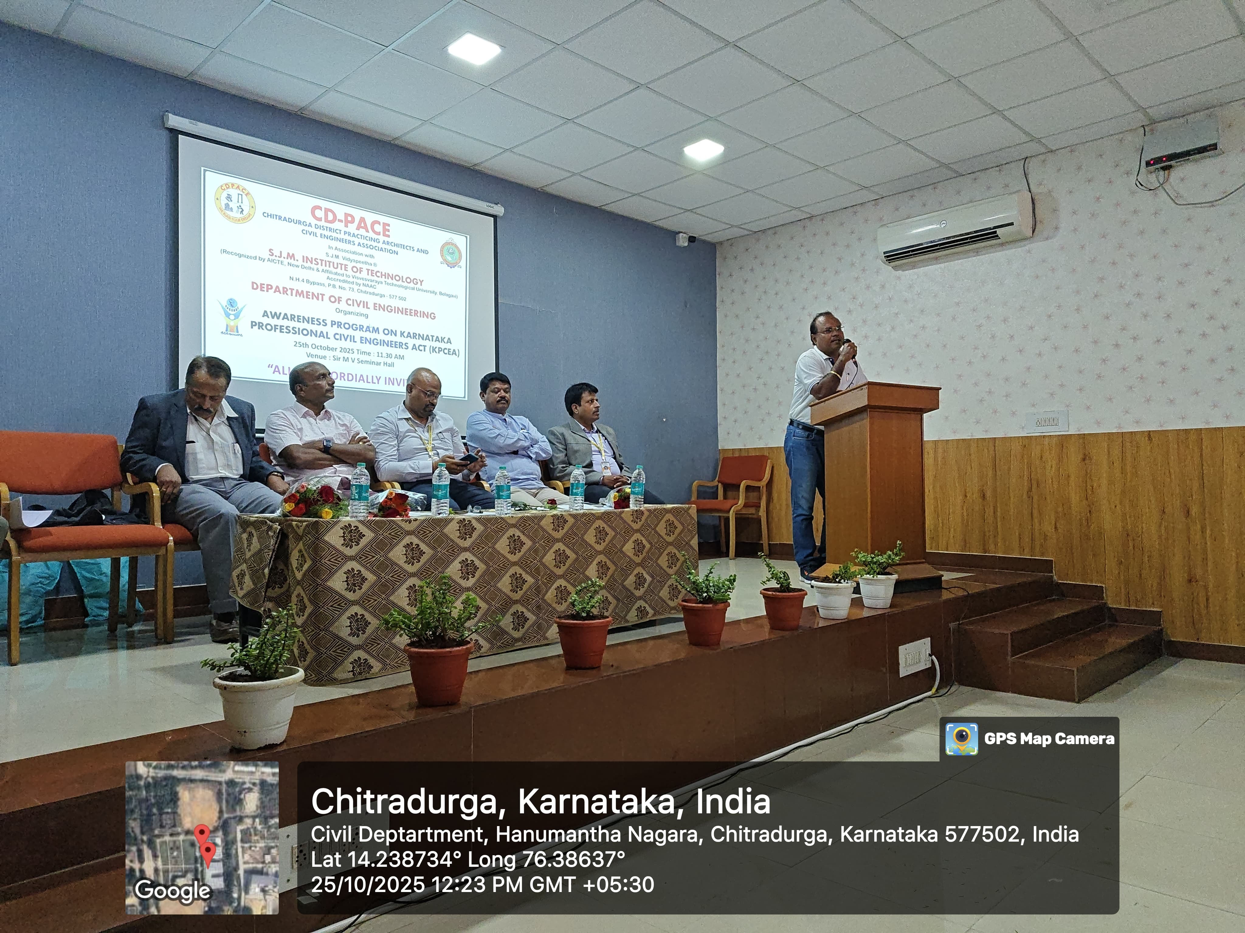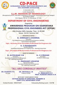 The Department of Civil Engineering, S.J.M. Institute of Technology, Chitradurga, in association with CD-PACE (Chitradurga District Practicing Architects and Civil Engineers Association), successfully organized an Awareness Program on the Karnataka Professional Civil Engineers Act (KPCEA) on 25th October 2025 (Saturday) at Sir M. V. Seminar Hall.