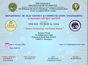 The Department of Electronics and Communication Engineering, SJM Institute of Technology, Chitradurga, in association with IQAC and ISTE, organized a One-Day Technical Talk on the topic “Sensor Technology and Smart Sensor” on 3rd November 2025 at A P J Abdul Kalam Seminar Hall.