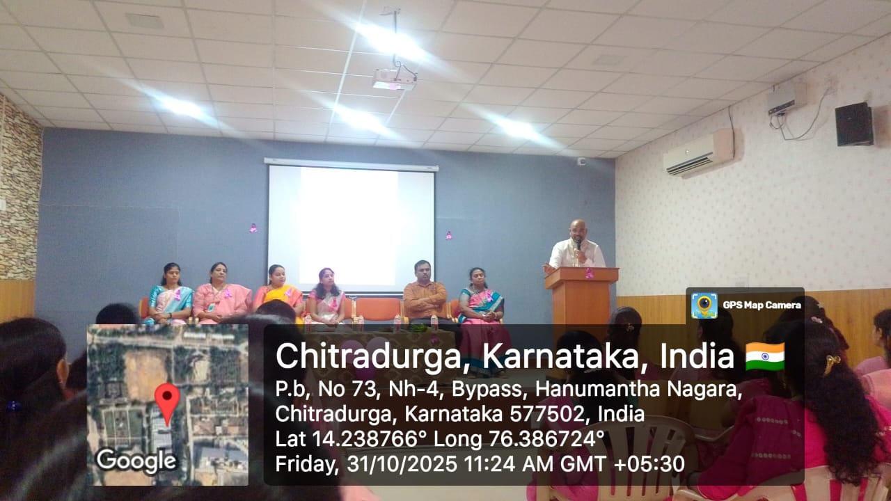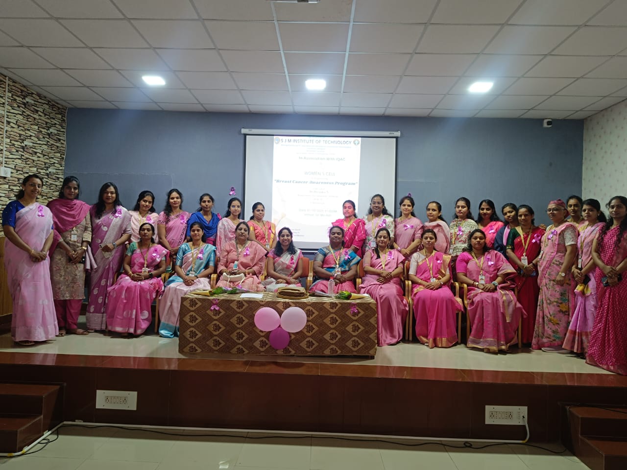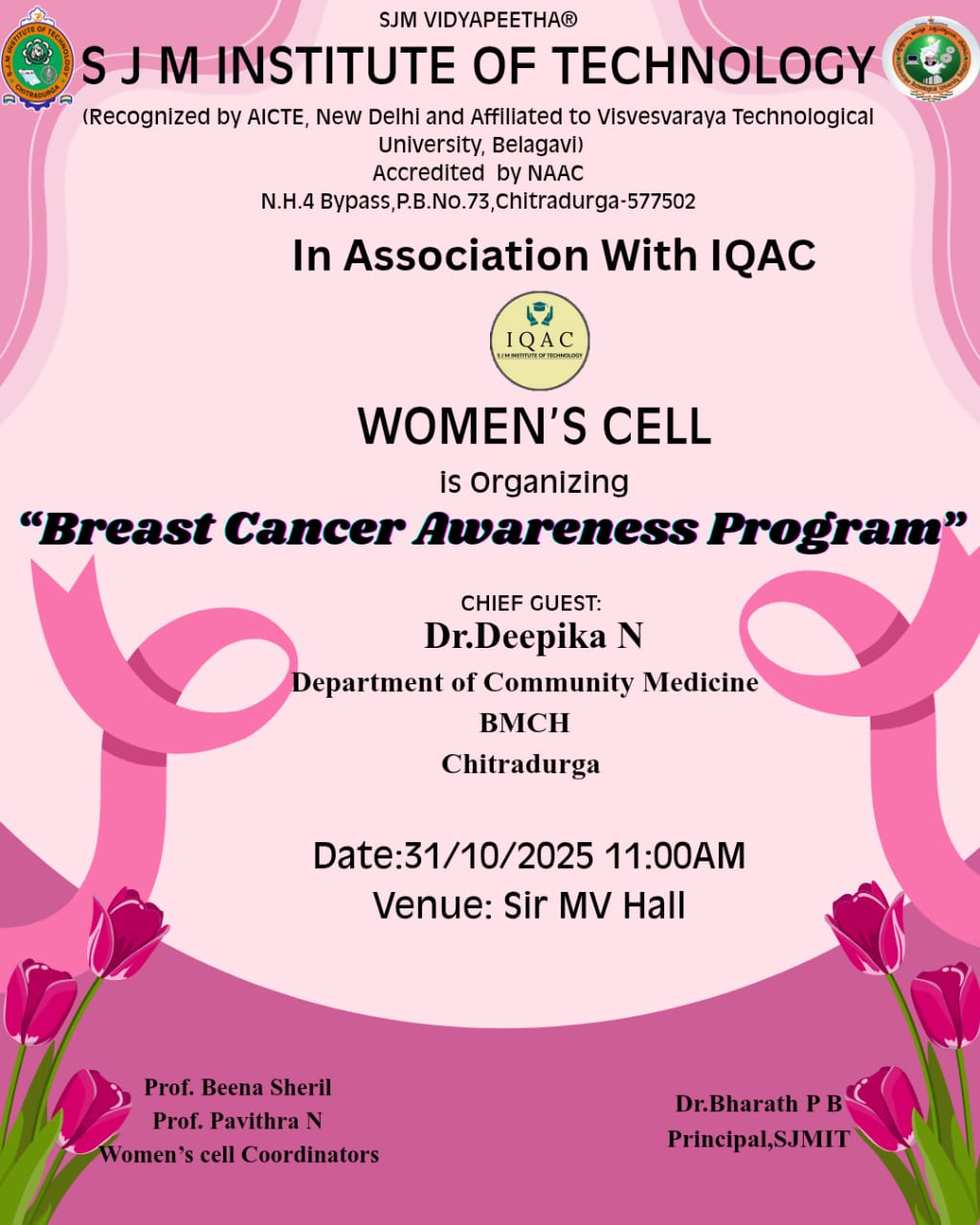 The Women’s Cell of S J M Institute of Technology, Chitradurga, in association with the Internal Quality Assurance Cell (IQAC), organized a “Breast Cancer Awareness Program” on 31st October 2025 at 11:00 AM in Sir M V Hall.
