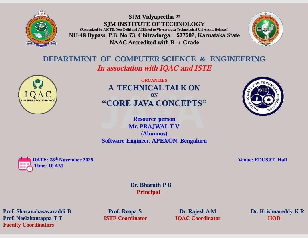 The Department of Computer Science & Engineering, in association with IQAC and ISTE, organized a technical talk on “Core Java Concepts” on 28th November 2025 at the EDUSAT Hall. The session was delivered by Mr. Prajwal T V, an alumnus of SJMIT and a Software Engineer at APEXON, Bengaluru. The event aimed to enhance students’ understanding of fundamental and advanced Java programming concepts essential for software development. The insightful session provided real-time industry examples, helping students bridge the gap between academic learning and practical application.