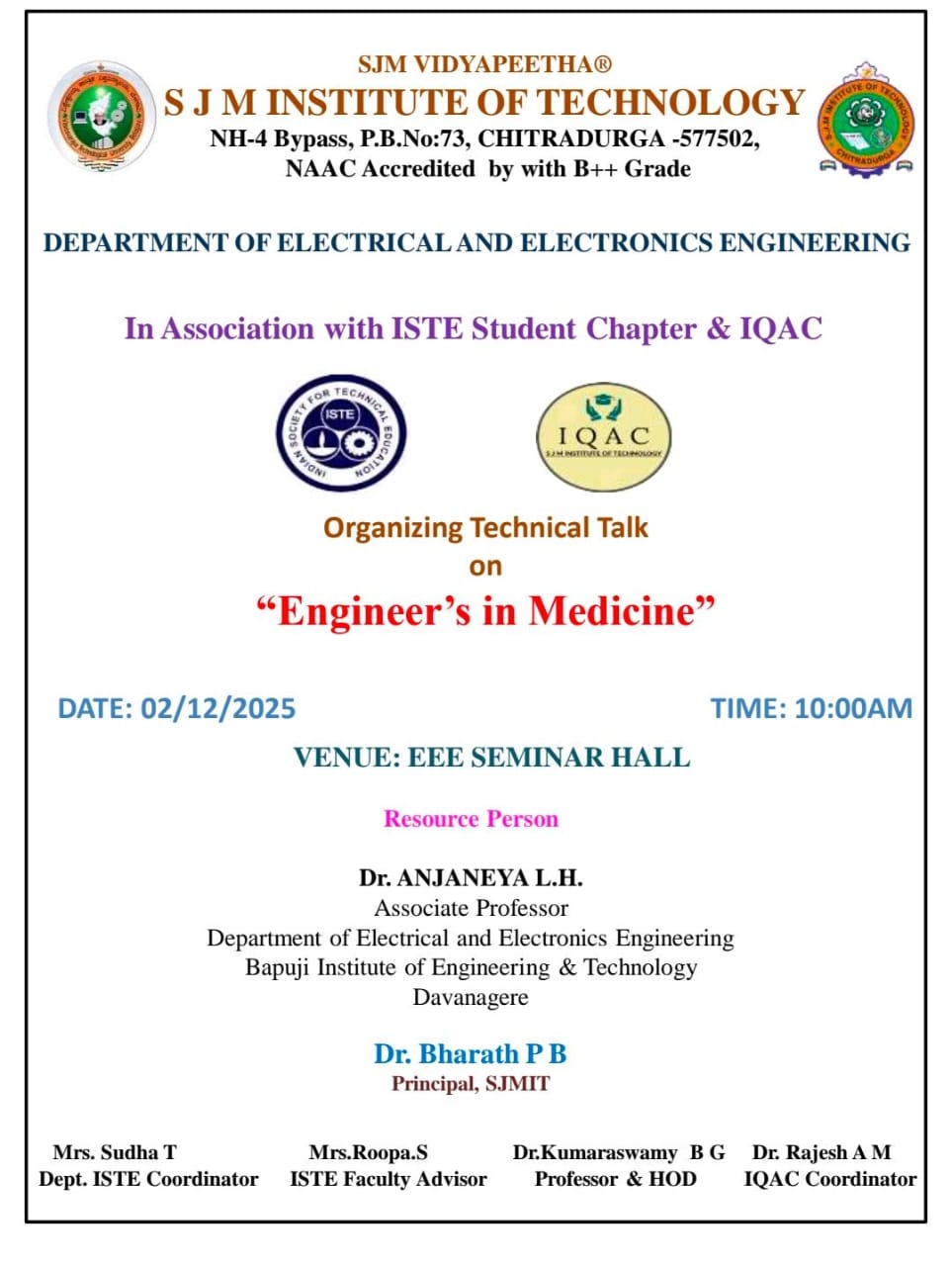 The Department of Electrical and Electronics Engineering, SJM Institute of Technology, Chitradurga, in association with the ISTE Student Chapter and IQAC, organized a technical talk on “Engineer’s in Medicine” on 2nd December 2025 at the EEE Seminar Hall.