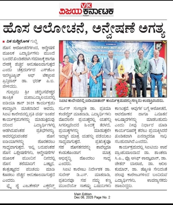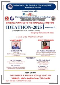 The Indian Society for Technical Education (ISTE), Karnataka Section, in association with Channabasaveshwara Institute of Technology, Gubbi, successfully concluded IDEATHON-2025 (Version 4.0), a prestigious state-level innovation contest aimed at fostering creativity, problem-solving, and entrepreneurial thinking among students.