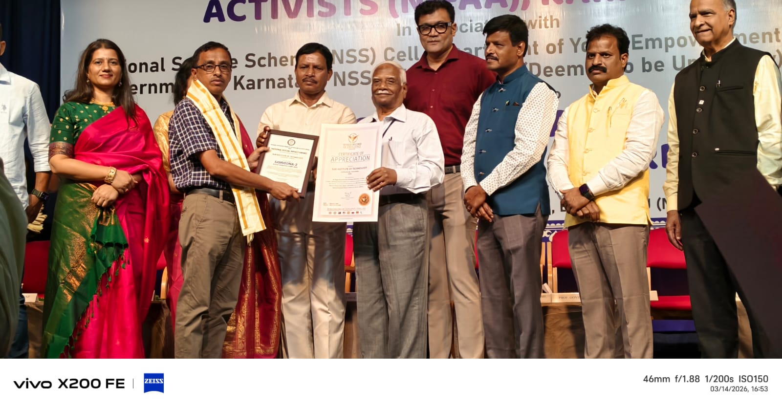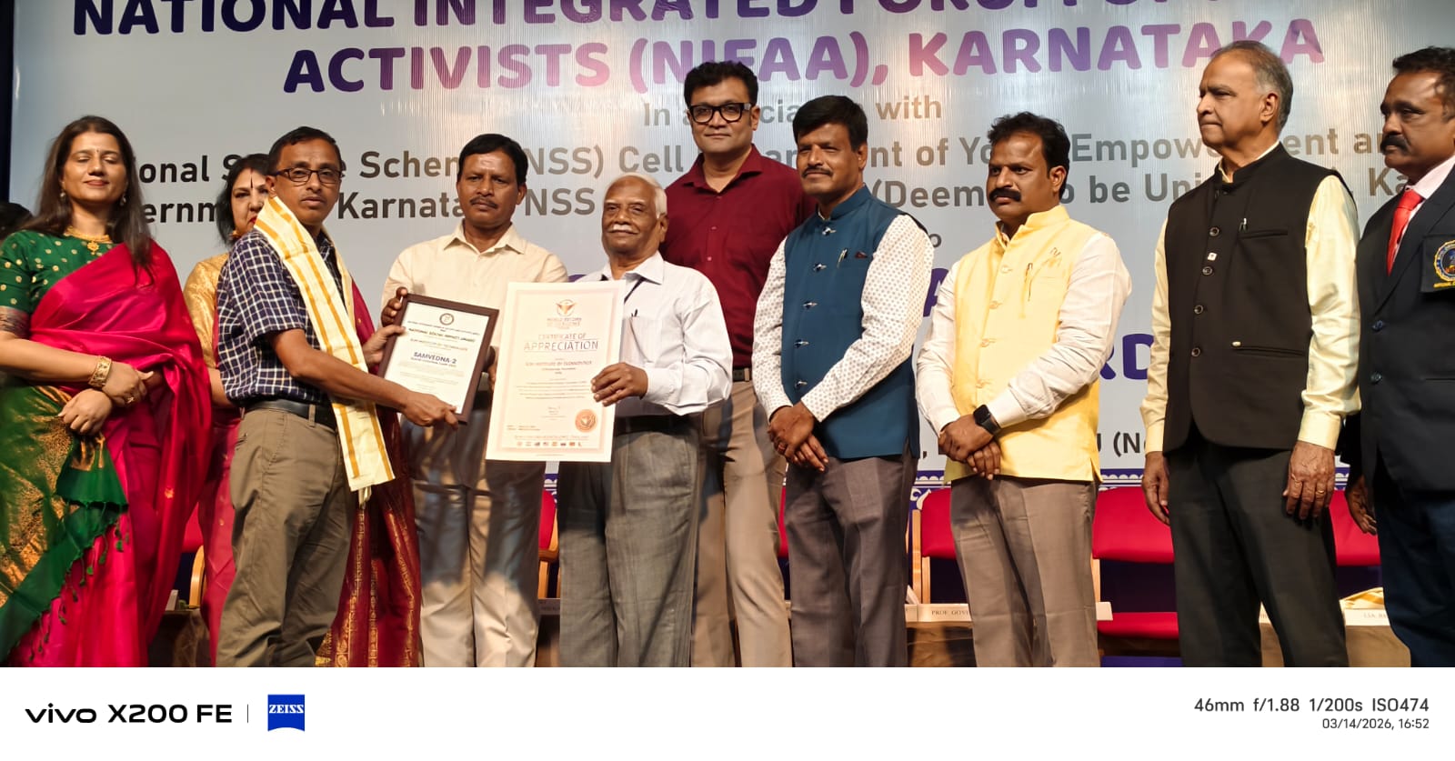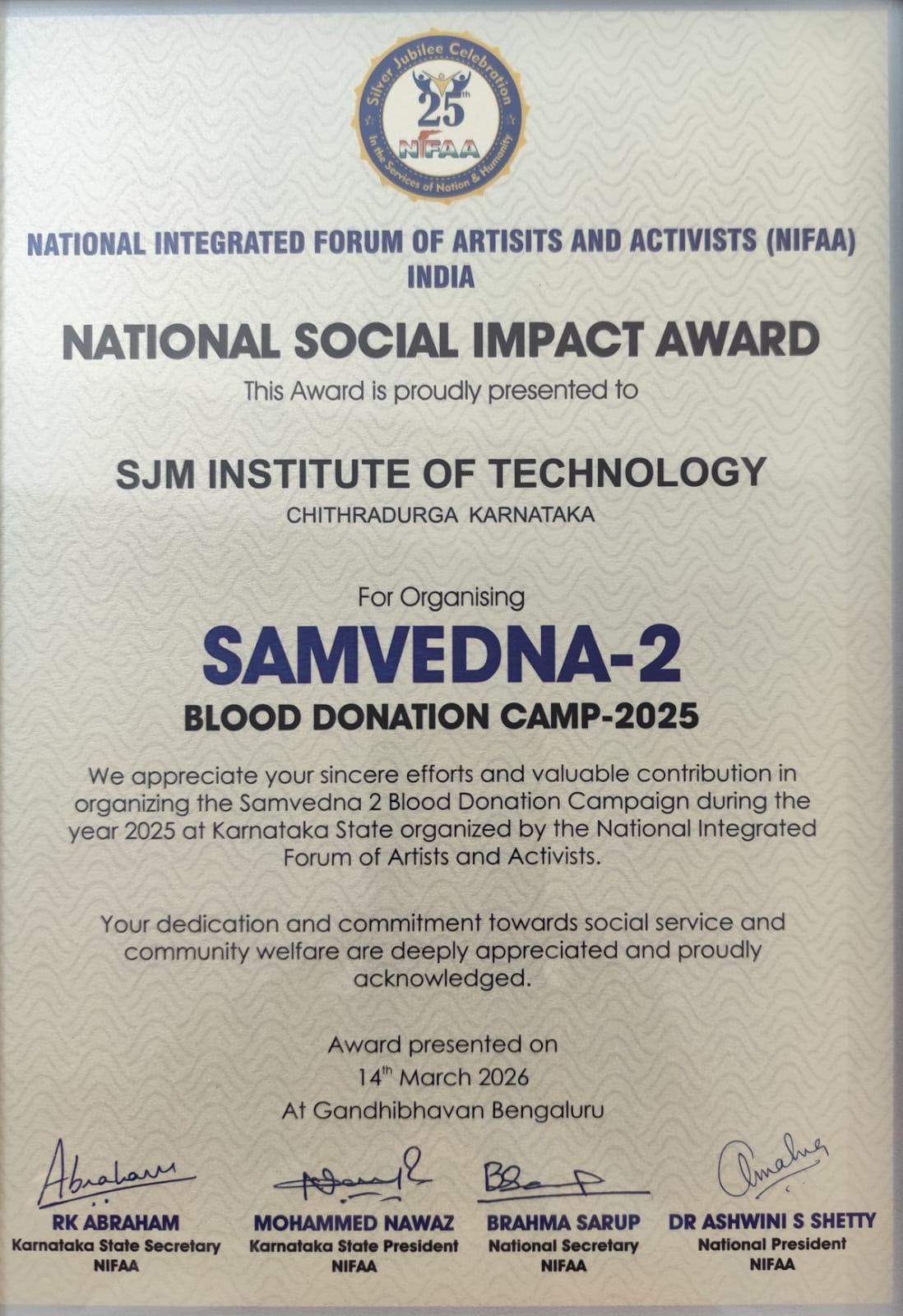 SJM Institute of Technology, Chitradurga, has been proudly conferred with the National Social Impact Award for its remarkable contribution to organizing the Samvedana-2 Blood Donation Camp 2025. The award was presented at a prestigious ceremony held on 14th March 2026 at Gandhi Bhavan, Bengaluru, organized by the National Integrated Forum of Artists and Activists (NIFAA), Karnataka, in association with the Department of Youth Empowerment and Sports, Government of Karnataka.