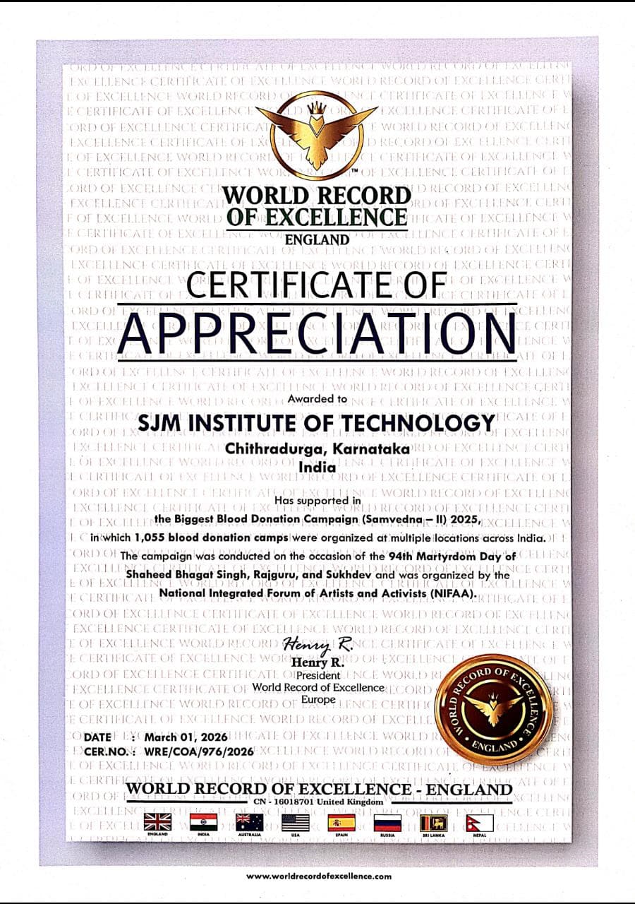 The Management, Principal, all the Heads of Departments, teaching and non-teaching staff of SJM Institute of Technology extend their heartfelt appreciation and gratitude to Dr. E. Niranjan, NSS Program Officer, for his dedicated efforts and valuable contribution in successfully organizing and representing the institution at the Samvedana-2 Blood Donation Award Ceremony.